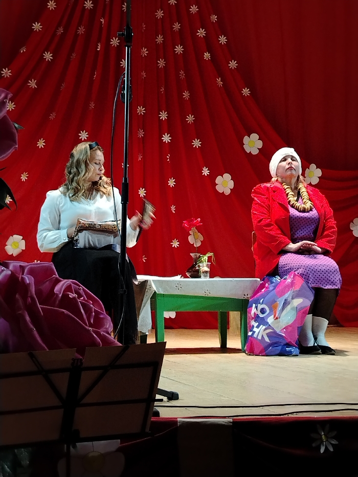 A stage scene in the city of Дойная, Russia, depicts two women on a light-colored stage floor against a vibrant red curtain backdrop. The red curtain is decorated with numerous white flower cutouts. On the left, a woman with wavy light brown hair, dressed in a white long-sleeved blouse and a black skirt, is seated behind a green table covered with a white tablecloth featuring small white flower patterns. She holds a patterned clutch bag in her left hand and a small, dark rectangular object in her raised right hand, appearing to examine it. A black microphone stand stands in the center-left, positioned in front of the table. On the right, a second woman, wearing a white headwrap, a bright red blazer, a purple polka-dotted dress, dark stockings, white socks, and black flat shoes, is seated. She wears a prominent necklace fashioned from multiple small, light-colored rings. Her hands are clasped in front of her, and her head is tilted slightly upwards, with her gaze directed towards the upper right. A multi-colored plastic shopping bag rests on the stage floor next to her feet. On the green table, a small vase contains artificial pink flowers and greenery. In the lower-left foreground, a large, partially visible prop resembling a dark pink rose is present, along with a black music stand.