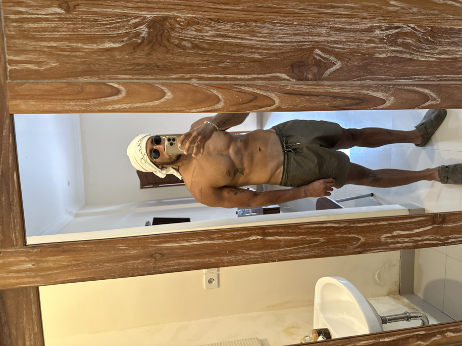 A male individual is depicted taking a mirror selfie in what appears to be a room within Pecatu, Indonesia. The individual, seen from the chest down to the feet, is shirtless, wearing dark olive-green swim shorts with a drawstring, and dark grey or olive-colored slip-on shoes. He has a muscular build, visible abdominal muscles, and dark hair beneath a white head covering with dark script lettering. Dark-rimmed sunglasses are worn, and a light-colored smartphone with a prominent camera array is held in his right hand, reflecting his face. A silver-colored bracelet is on his left wrist, and a ring is on his left ring finger. Tattoos are visible on his left arm and torso. The mirror's wooden frame, featuring a light-colored distressed or natural wood grain, borders the reflection. In the reflection, the room's walls are light-colored, possibly cream or light yellow. To the left, a white ceramic sink is mounted to the wall, below which is a small counter or shelf holding bottles, one with an orange liquid. The wall above and around the sink shows evidence of water damage or discoloration in multiple spots. An electrical outlet is visible on the wall to the left of the individual. In the background, beyond the individual, parts of a light-colored door and a dark-legged chair are visible, suggesting a room with access to another area. The ceiling is white, and a light fixture is faintly visible in the upper reflection. The floor appears to be a light-colored tile.