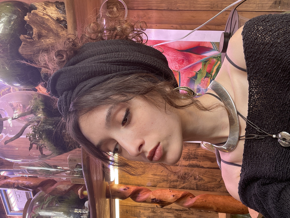 A medium shot captures a young female adult posing indoors. She has dark, wavy hair, with some curls escaping from a black textured headscarf or turban. Her face is turned slightly to her left, looking upwards, with a neutral expression and slightly parted lips. She wears a black, off-the-shoulder knitted top, a wide, rigid silver-toned choker necklace with a ribbed surface, and a black cord necklace with a silver-toned, organic-shaped pendant. A single silver-toned teardrop-shaped earring with decorative texture is visible on her right ear. The background consists of wooden shelves and paneling, suggesting an indoor setting such as a shop or studio. Visible on the shelves are multiple glass terrariums or vases containing various plants, moss, and dried wood. One terrarium contains a label with "AIR" visible. A small yellow and white decorative mushroom figurine rests on a lower shelf. A vertically oriented, carved wooden element serves as a shelf support on the left. Illumination includes a horizontal strip light under a shelf on the left and a prominent pinkish-purple light source from the right, which highlights a partially visible, colorful poster or artwork, predominantly red and green, on the far right. A white cable runs vertically in front of this poster. A framed item with indecipherable text is visible on the upper left shelf. The specific location within Pardes Hana-Karkur, Israel, is not discernible from the visual evidence presented in the image.