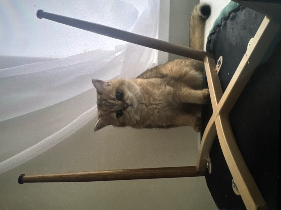 An indoor scene depicts a light brown/ginger cat, possibly a British Shorthair, sitting upright and facing forward. The cat is positioned behind an inverted chair in the foreground. The chair's structure features four dark wooden legs and a lighter wooden cross-brace support, with the dark underside of its seat visible. The cat's tail extends to the right, behind a chair leg. In the background, diffused natural light enters through a window covered by sheer white curtains. No human subjects are present. The specific location within Красный Маяк, Russia, cannot be determined from the visual evidence.