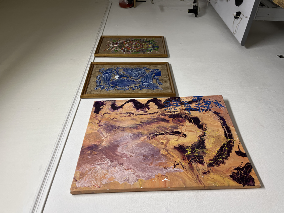 The image displays an indoor setting, likely a workshop or studio. The walls are painted a light, uniform color, and a white crown molding runs horizontally along the upper portion of the wall. Three distinct artworks are visible. On the left, a large, vertically oriented abstract painting on canvas leans against the wall, slightly angled towards the viewer. This painting features fluid patterns in shades of orange, purple, yellow, and dark brown, with additional blue, graffiti-like markings concentrated in its lower right quadrant. To the right of this abstract piece, two smaller, vertically oriented artworks are framed and mounted on the wall. The first framed piece exhibits an intricate blue design, possibly a stylized creature or floral motif, set against a textured, light brown background within a simple wooden frame. Adjacent to it, the second framed artwork, also in a wooden frame, presents a colorful, symmetrical, mandala-like pattern featuring a central element and various hues including red, green, yellow, and brown. In the far right background, a segment of a white table with a light gray surface is visible. On this table, a white power cord and two black spools of thread are present. Above the table, a red object is partially visible on a white wall-mounted shelf. No individuals are depicted. The lighting appears to be from an internal source. Visual evidence within the image does not confirm the specific city as Bahía Blanca, Argentina.