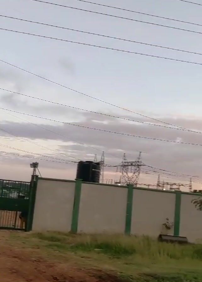 n electrical power station at dusk. The station is enclosed by a wall with green accents. Several electrical towers and structures are visible inside the enclosure, with power lines stretching across the sky. The sky is overcast with hints of sunset colors on the horizon. The foreground consists of a dirt road and some grassy areas. The camera pans slowly from left to right, providing a view of the entire power station. There are no people visible in the frame.