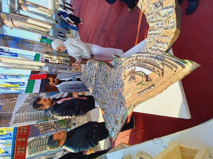 The scene depicts an outdoor or semi-outdoor exhibition in Shab'a, Syria, featuring four individuals engaged in a discussion around a large architectural scale model
