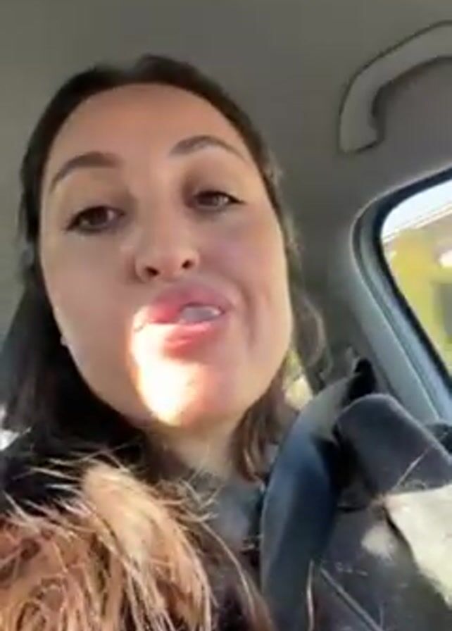 A woman with long brown hair and wearing a gray sweatshirt is sitting in the driver's seat of a car. She is wearing a seatbelt. She looks at the camera and then looks at the road as she drives. The weather outside is sunny. Music is playing.