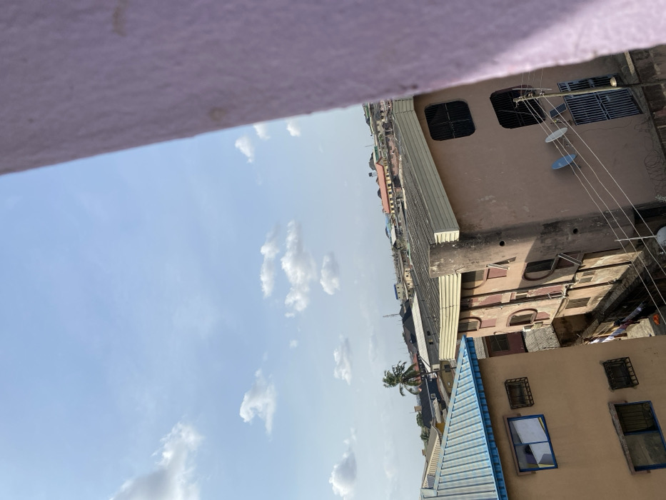 The image depicts an elevated view of a dense urban residential area in Alagba, Nigeria, under a clear blue sky with scattered cumulus clouds. In the immediate foreground on the right, a textured, light purple vertical surface occupies approximately one-fifth of the frame, indicating the structure from which the photograph was taken. In the midground, two multi-story buildings are prominent. To the left, a light brown building features a blue corrugated metal roof and multiple windows, some fitted with metal grates. One upper-floor window appears open or broken, revealing a white interior. To the center-right, another multi-story building, peach-toned, presents a light-colored corrugated metal roof and distinctive, dark, oval-shaped window openings. Two satellite dishes, one white and one blue, are affixed to its exterior wall. Barbed wire lines the top of a wall at the base of this building. A narrow, dark alley runs between these two main buildings, where laundry is visible hanging on lines to dry, indicating human activity. Several electrical wires traverse the scene horizontally in the lower midground. The background reveals a sprawling cityscape of numerous buildings, primarily multi-story with various roof types, extending to the horizon. A single palm tree stands to the left of the center, taller than adjacent structures. Distant infrastructure includes a dark water tank on a rooftop and a tall telecommunication mast or antenna. No individuals are directly visible in the scene.