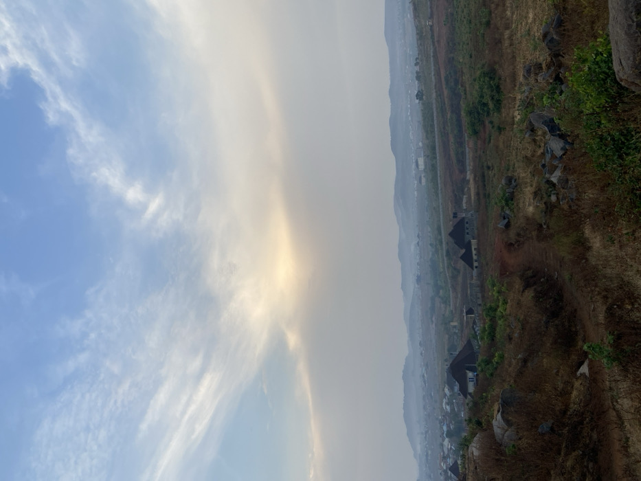 A landscape scene reveals a bright sky transitioning to hazy air. The sky, filled with soft, wispy clouds, contrasts with the land below, which is rocky and uneven, dotted with shrubs. In the distance, buildings are visible, nestled against a hazy backdrop that obscures the horizon. The scene evokes a sense of serene remoteness.