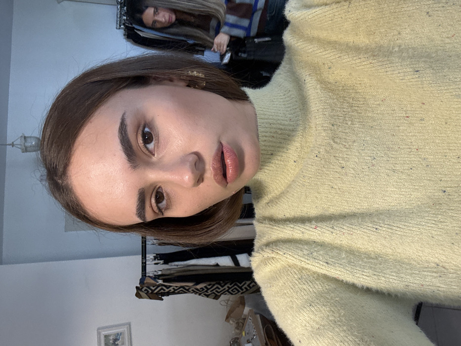 The image depicts an indoor scene, likely a retail clothing boutique or a dressing area, located in Kfar Yona, Israel. In the foreground, a young adult female faces the camera directly, appearing to take a self-portrait. She has shoulder-length brown hair, prominent dark eyebrows, and is wearing a light yellow, high-necked, fuzzy-textured sweater speckled with small colorful fibers. Her lips are slightly parted and appear to have a glossy finish. In the background, to the right of the primary subject, a second female individual is partially visible and out of focus. She has longer, lighter brown hair and is wearing a horizontally striped sweater. Her facial expression is difficult to ascertain but appears neutral to slightly unamused. The environment includes dark-colored clothing racks displaying various garments to the left and right, a light-colored wall, a small framed picture with a light mat on the upper left wall, and a light-colored pendant light fixture suspended from the ceiling. A surface to the left holds several small objects and a brown paper bag.