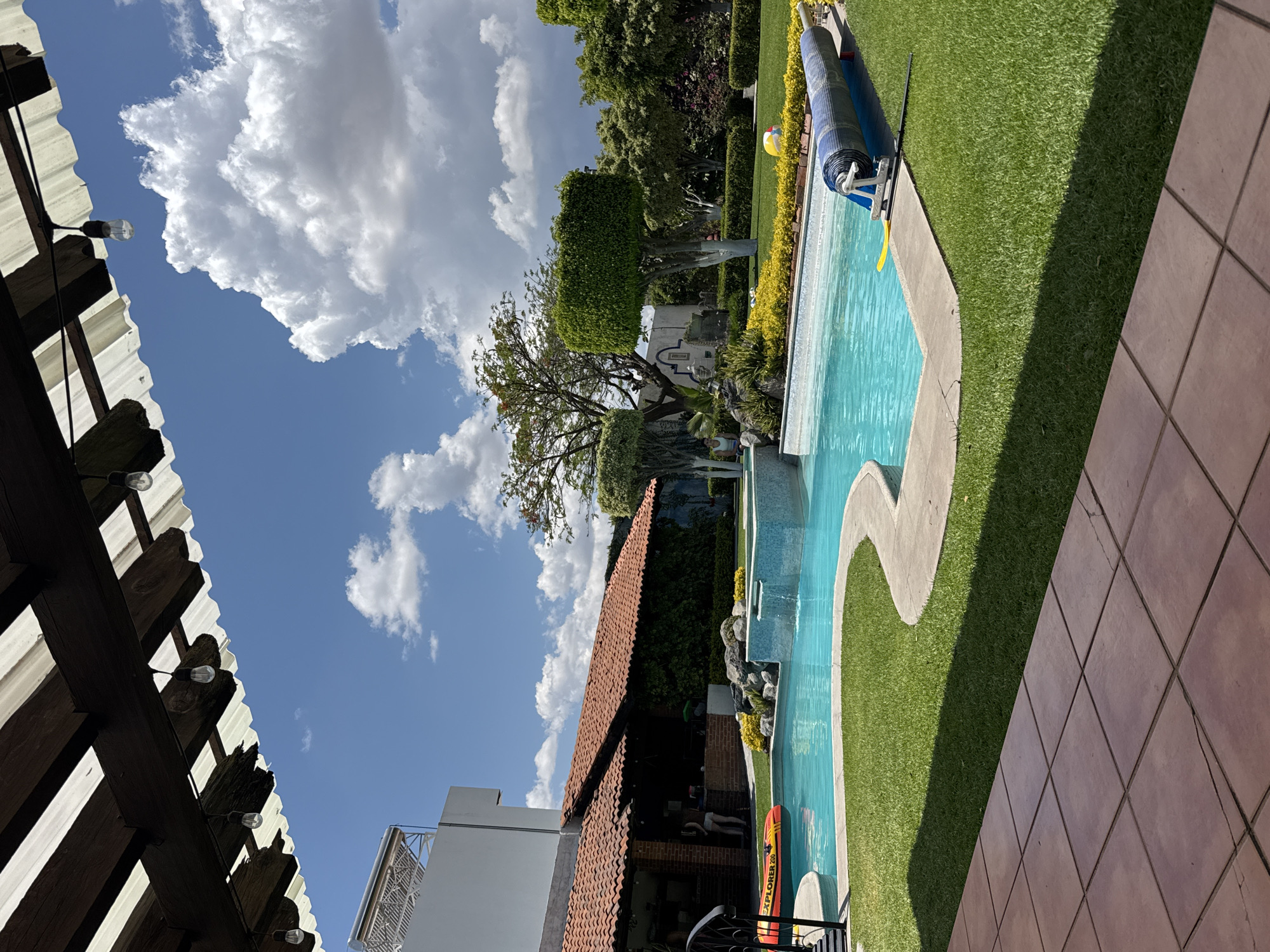 backyard in Puebla, Mexico, featuring a swimming pool and adjacent structures. The pool is filled with light blue water and bordered by a concrete edge and green artificial turf. Adjacent to the pool is a tiled patio area. A one-story building with a red tile roof is visible, with a white two-story building attached. A pergola-like structure with string lights is to the left, partially obscuring the sky. Cumulus clouds fill the sky. In the background, tall green trees and manicured hedges surround the backyard. An inflatable raft is next to the pool. No people are clearly visible.