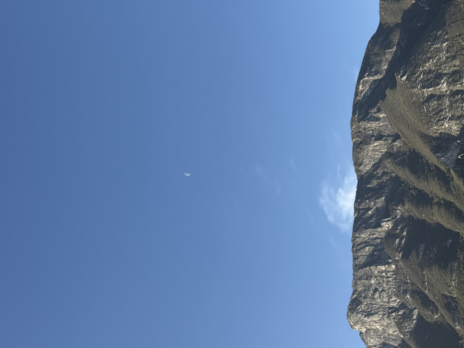 The image displays a vast outdoor scene located in Ciudad Santa Catarina, Mexico, featuring a prominent mountain range under a clear blue sky. The mountain, likely part of the Sierra Madre Oriental, occupies the lower half of the frame, presenting steep, rugged terrain. Its upper sections consist of grey and white exposed rock formations with vertical striations, indicative of limestone cliffs. The lower slopes are densely covered in dark green scrub or low vegetation. In the upper right quadrant of the deep blue sky, a pale, waxing crescent moon is visible. A few faint, wispy white clouds are present near the horizon line, just above the mountain peaks. No individuals, artificial structures beyond the landscape, or specific actions or interactions are depicted. The lighting suggests daytime conditions.