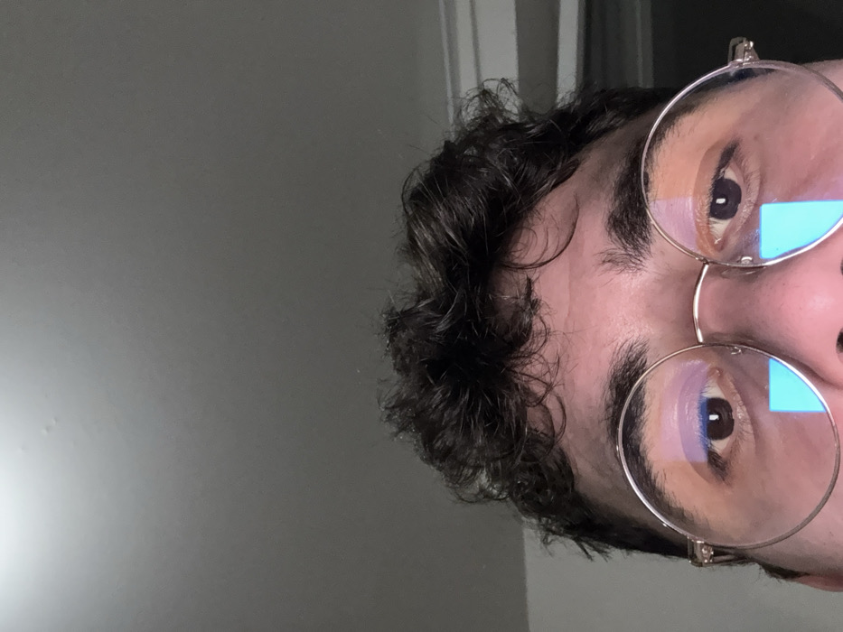 A close-up, slightly rotated shot features a person wearing round-rimmed glasses. Their dark, wavy hair is visible along the forehead, and the eyes are directed towards the viewer, reflecting a bluish light source. The background is a muted gray wall. The angle emphasizes the upper portion of the face, capturing details like eyelashes and the subtle textures of the skin and hair.