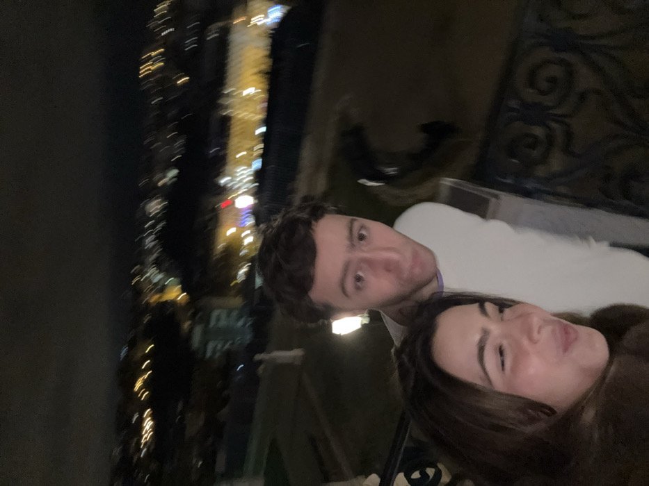 A dimly lit, slightly blurry photograph captures a couple at night. The man, with short dark hair and wide eyes, wears a white shirt. The woman, with long dark hair, is positioned slightly below him. Blurred city lights illuminate the background. The ornate railing of a balcony is visible in the lower portion of the frame.