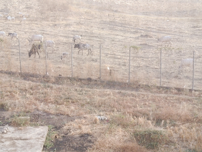 The image depicts a dry, open landscape in Unknown, Nigeria, under daylight conditions. The foreground features parched, brown and yellow grass intermixed with areas of exposed dirt, and a partial concrete slab is visible in the lower-left corner. A thin, horizontal line of green vegetation also appears near the slab. Approximately in the mid-ground, a wire fence, consisting of grey vertical posts and thin horizontal strands, traverses the scene, extending from left to right. Behind this fence, a herd of approximately fifteen domestic cattle is distributed across the dry, light-brown terrain, which slopes upwards towards the background. The cattle exhibit varying coat colors, including white, light grey, dark brown, and mottled white and black/brown patterns. Several cows are seen grazing or standing; notable examples include a dark brown cow with horns near the center-left, a predominantly white cow with prominent horns to its right, and a spotted cow further right, all positioned behind the fence. Multiple calves are also present among the herd. The background consists of a barren, dusty hillside devoid of substantial vegetation. No human figures are visible in the frame.