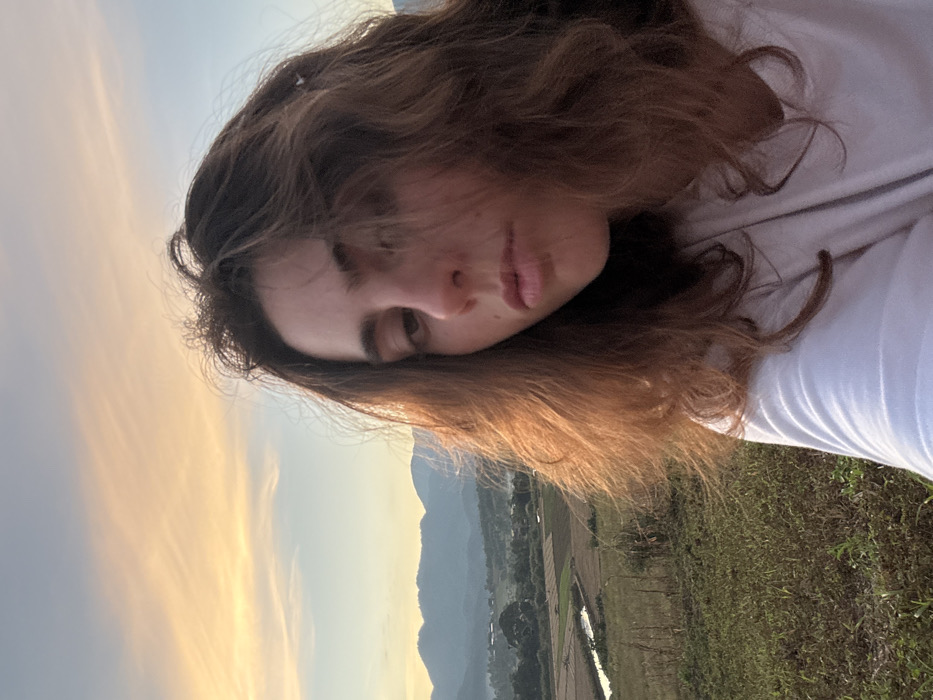 The image presents a forensic-style selfie of a female individual in the foreground, set against a natural landscape, asserted to be in Ban Mae Ping, Thailand, during golden hour. The individual, appearing to be a young adult, has medium-long, wavy, light brown hair, which is somewhat disheveled and exhibits warm highlights on her left side. Her face is positioned slightly off-center to the right, with a neutral expression and slightly parted lips. She is wearing a white long-sleeved shirt, visible on the lower right of the frame. The background features a sky with hues transitioning from light blue at the top to soft orange and pink closer to the horizon, indicative of sunrise or sunset. A range of hazy, dark mountains or hills spans the mid-ground. Below the mountains, a valley unfolds with cultivated fields in shades of green and brown, through which a narrow body of water, likely a river or canal, meanders. The immediate foreground on the left consists of a grassy slope with interspersed dry vegetation.