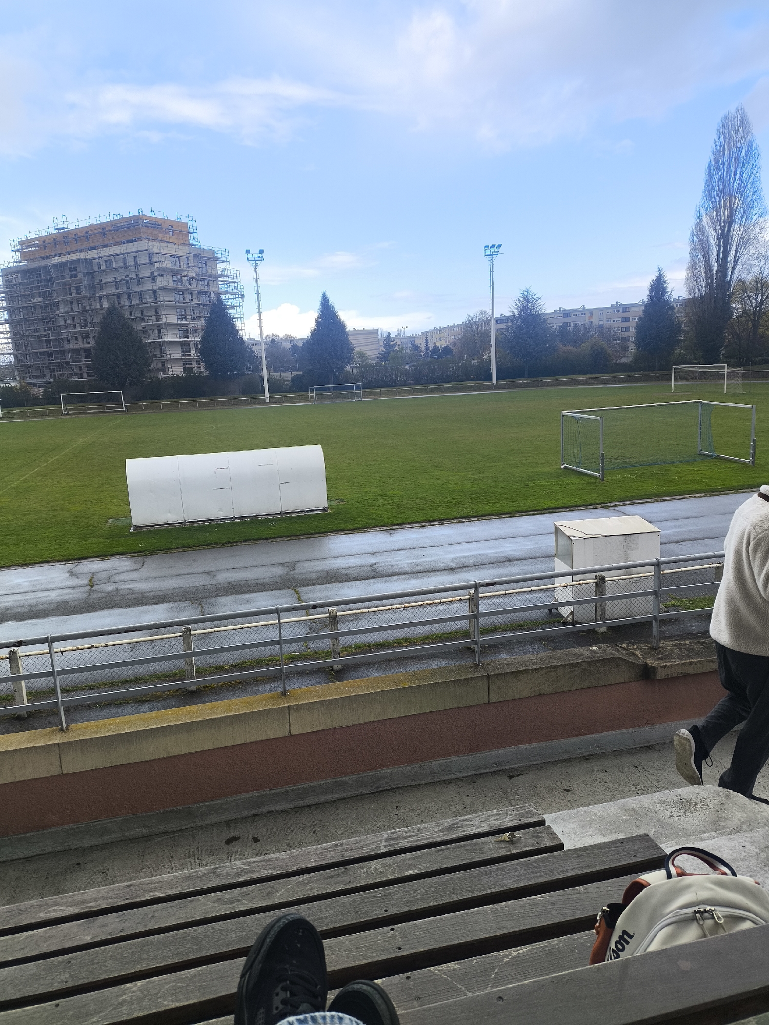 A stadium in Schiltigheim, France is depicted from an elevated perspective on stadium seating. The stadium features a green grass field, with two soccer goals visible, along with a white shelter and a small white box next to the running track. Behind the field are trees and buildings, including one under construction and a row of residential buildings. The seating area has wooden planks. In the foreground, a person's feet wearing black shoes are visible. A white Wilson backpack is also on the bench. Another person, wearing a white jacket and dark pants, is walking up the steps on the right side of the frame. A metal fence separates the seating from the running track. The sky is partly cloudy.