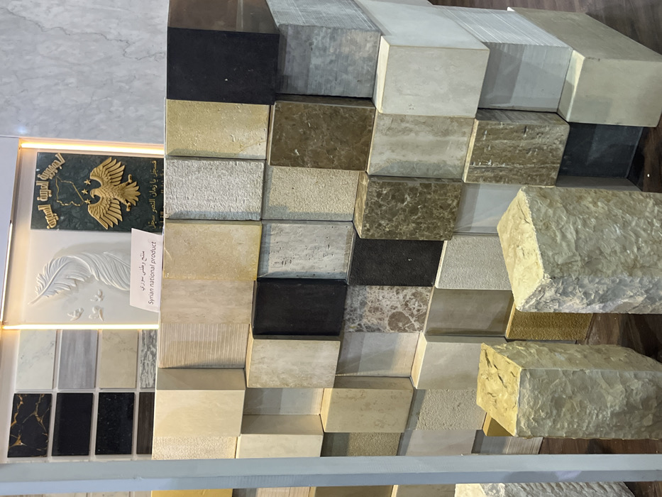 An indoor display in Shab'a, Syria, showcases various Syrian national stone and marble products