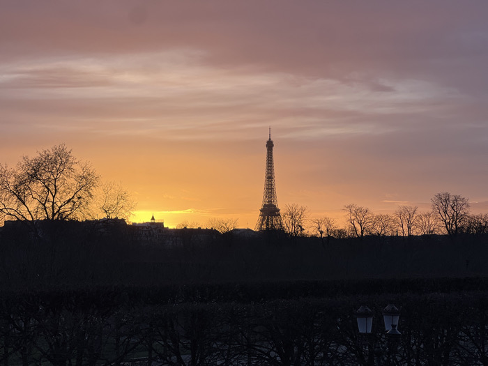 The Eiffel Tower stands silhouetted against a vibrant sunset in Paris