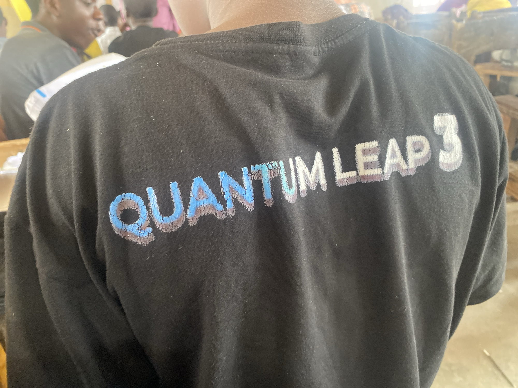 The image depicts the back of an individual wearing a black short-sleeved t-shirt with the phrase "QUANTUM LEAP 3" printed across the upper back in a distressed, multi-toned blue and white font. The lettering appears worn or cracked. The individual is positioned indoors in Alagba, Nigeria, facing away from the camera. In the blurred background, other individuals are visible, suggesting a gathering or event. To the left, a person with dark skin is partially visible, wearing a dark grey or black shirt. Other indistinct figures and objects, possibly furniture or equipment, are present in the ambient background, indicating an indoor setting like a classroom, hall, or workshop. No direct interactions or specific actions are discernible from this perspective.