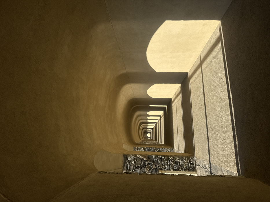 The image displays a long, covered, arched pedestrian walkway, identifiable as a section of the Via dell'Amore in Manarola, Cinque Terre, Italy. The structure features a continuous vaulted ceiling and smooth, light ochre-colored plastered walls and ceiling. On the right side, a series of uniformly spaced, rounded archways are visible, allowing strong, direct sunlight to penetrate. This sunlight casts prominent, elongated, dark rectangular shadows across the textured, light-colored aggregate floor and onto the continuous solid wall on the left. The left wall incorporates several periodically spaced, rectangular pillars or sections constructed from irregularly shaped, dark grey stones. The walkway extends into the distance, creating a sense of depth as the archways and walls converge towards a brighter area at the vanishing point. The scene is devoid of people, subjects, or objects other than the architectural elements.