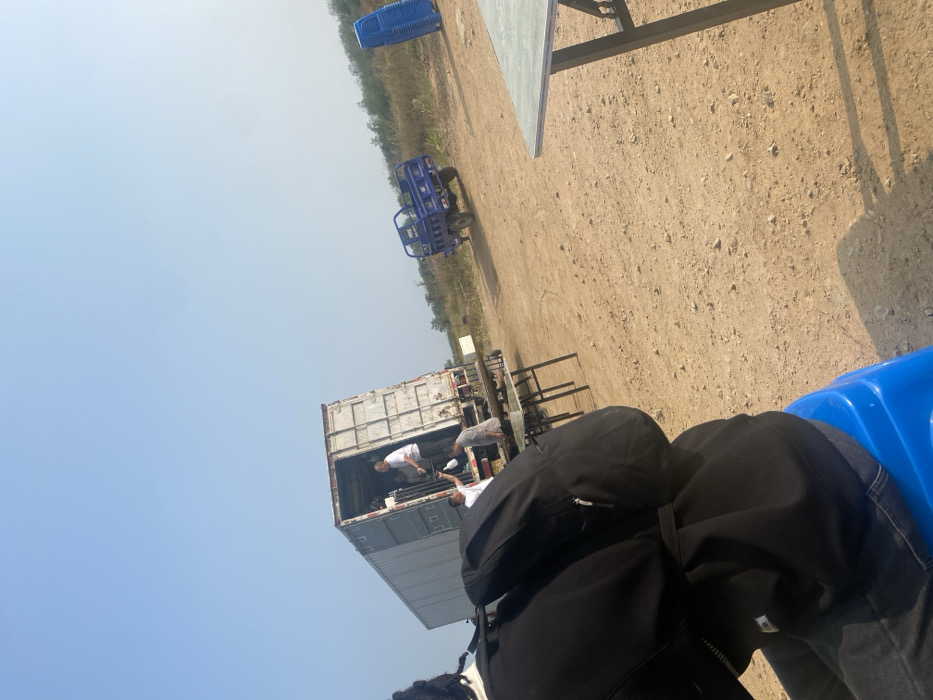 A low-angle shot captures a group of people unloading items from a shipping container. The container is situated on a dirt or gravel ground. In the distance, there's a blue cart and some stacked blue chairs. A table and some metal structures are also visible. The sky is bright and clear. A person wearing a black jacket and holding a backpack appears in the foreground, partially obstructing the view.