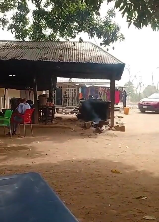 n outdoor scene in what appears to be a rural area. The foreground features a blue table, partially visible, with a metal bowl on it. The midground contains a simple structure with a corrugated iron roof, under which people are sitting on plastic chairs. Behind the structure, clothing is displayed for sale. In the background, cars drive by on a dirt road. A small fire is smoldering near the structure, and chickens are visible in the area. A large tree provides shade over the scene.