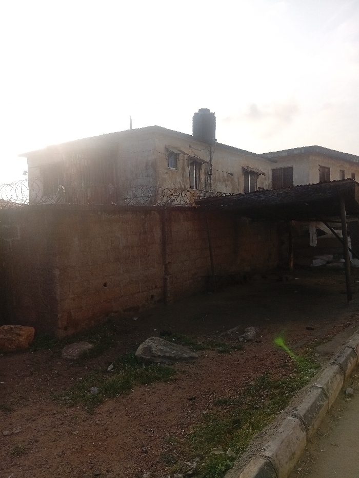 This image captures an outdoor scene in Ozuri, Nigeria, under bright natural light, likely late morning or afternoon, evidenced by strong shadows and lens flare. The primary subject is a two-story building complex, constructed of concrete with a weathered, light-colored exterior, visible in the mid-ground. A black cylindrical water tank is situated on its flat roof. Multiple windows on the upper floor feature awnings or closed shutters. In the foreground, a perimeter wall constructed of unrendered brown concrete blocks runs horizontally, topped with multiple strands of concertina barbed wire. To the right of the building, partially obscured by the wall, is a rudimentary lean-to structure with a corrugated metal roof supported by wooden poles, from which fabric items are visibly hanging in the shadow. The ground area in front of the wall is composed of reddish-brown soil with sparse patches of green vegetation and several scattered rocks of varying sizes and colors. A grey concrete curb line is present along the far right edge of the frame, indicating the boundary of a pathway or road. No individuals are present in the scene. The sky above is bright with scattered clouds.