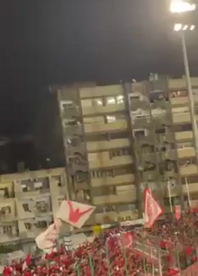 large crowd of soccer fans at a stadium during an evening game. The fans are mostly wearing red and holding red and white flags. They are packed into the stands, cheering and waving their flags. The camera is positioned within the crowd, providing a close-up view of the fans and their enthusiasm. Tall apartment buildings are visible beyond the stadium. Floodlights illuminate the field, and a number of uniformed security personnel are visible along the edge of the field.