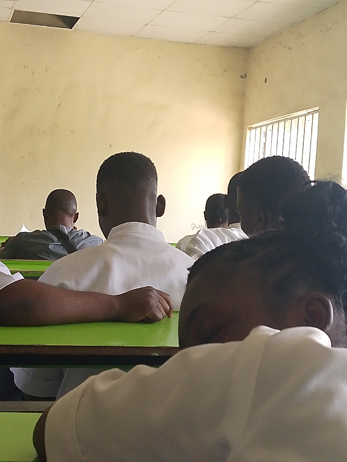 The image depicts an indoor classroom or lecture hall in Keffi, Nigeria, seen from a low perspective behind seated individuals