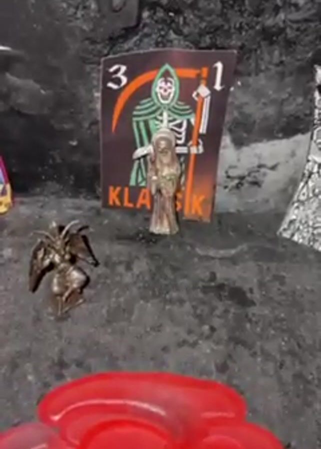 n altar with a red candle surrounded by melted wax. In the background is a picture of the Grim Reaper next to a silver-colored miniature of a robed figure and a figurine resembling a gargoyle or winged demon. The altar sits against a dark, textured backdrop, possibly meant to represent a cave or rocky environment. The camera then moves to show a tattoo on someone's skin, which appears to depict the Grim Reaper figure from the altar in the background.