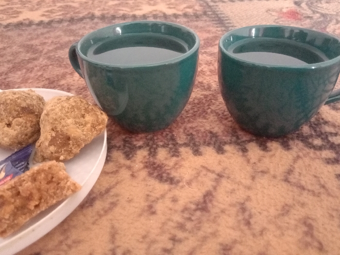 The scene depicts an indoor setting in Quetta City Tehsil, Pakistan. Two teal-colored ceramic mugs, each containing a dark, non-transparent liquid, are positioned on a patterned rug. To the left, a partially cropped white ceramic plate rests on the same rug. On this plate, three distinct light brown, crumbly food items are present: two irregular, roughly spherical masses and one rectangular bar. A small, partially visible blue packet or wrapper is also on the plate. The rug features a light brown base with intricate dark brown and maroon patterns. No individuals are visible in the scene.