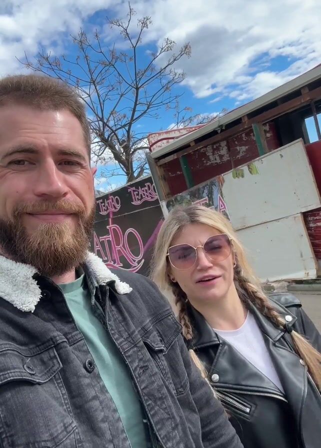 The video begins with a selfie of a bearded man and a woman with blonde hair in sunglasses