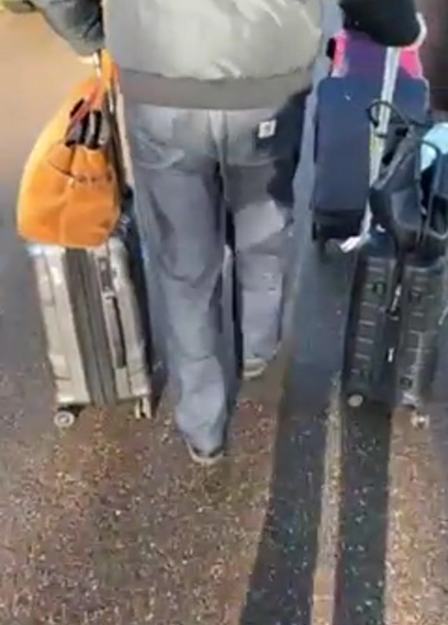 A person pulls two rolling suitcases across a wet, dark-pavement surface. The person wears a gray jacket, gray pants, and dark shoes, and is seen from the waist down. The suitcase on the left is silver-gray and has a tan tote bag on top of it. The suitcase on the right is dark-gray or black and has a black Carhartt jacket draped over it. The person is walking away from the camera, and a shadow is cast to the right.