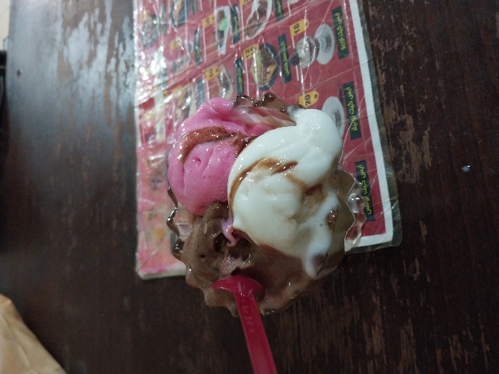 A cup of ice cream rests on a wooden table covered with a faded menu. The ice cream consists of three flavors: pink, white, and chocolate, each drizzled with chocolate syrup. A red spoon is visible, sticking out from under the chocolate scoop. The menu beneath the ice cream is partially covered in plastic, showing prices and images of desserts. The table has dark wood tones.