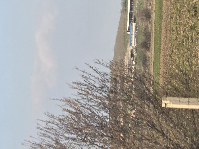 The image presents a rural landscape in Belozem, Bulgaria, under a clear, light blue sky with one elongated white cloud in the upper background. The left foreground is dominated by a deciduous tree with numerous bare, thin branches. Below the tree, a vertical, light-colored concrete fence post is visible. The midground consists of agricultural fields showing patches of brown earth and green vegetation, indicating fallow land or early growth. Several small, low-lying bushes are scattered within these fields. In the middle distance, a group of agricultural or industrial buildings with light-colored walls and blue roofs are situated against a gently sloping, barren hill or ridge. Additional elongated structures with lighter roofs are visible to the right of the main building cluster. No individuals, explicit actions, or interactions are discernible.