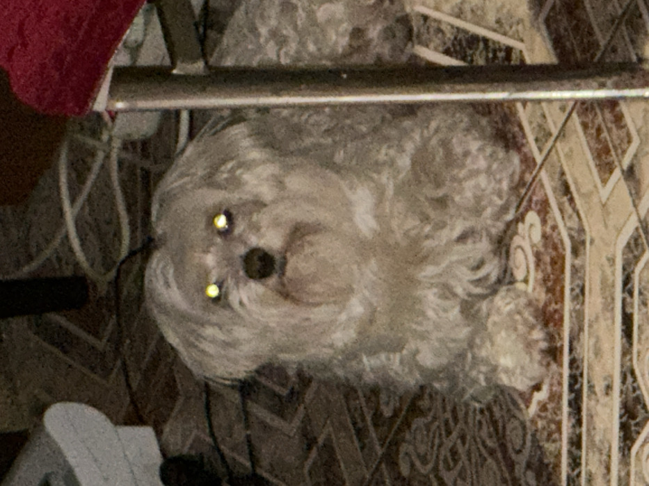 A light-furred, long-haired dog is depicted lying prone on a geometrically patterned tiled floor. The dog, positioned centrally, faces forward with its head raised. Its eyes display a distinct yellow-green retroreflection, indicating illumination by a flash. The fur is shaggy and appears off-white or light grey. The floor features a repeating tile pattern in shades of brown, beige, and red, incorporating ornate scrollwork. In the upper-left quadrant, a light-toned object and multiple electrical cables are partially visible on the floor. A vertical, polished metallic cylindrical leg, likely from an item of furniture, is present on the right side of the frame, partially obscuring the dog's right side. Above this leg, a blurred red object, consistent with upholstery, is visible. The scene is an indoor environment in Montana, Bulgaria. No active movement or interaction is observed from the dog.