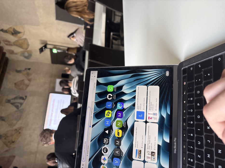 - "A first-person perspective photograph captures a person operating a silver MacBook Pro laptop on a white table within a lecture or conference room in Krems an der Donau, Austria" by FM-WG4aF3, licensed under CC BY 4.0