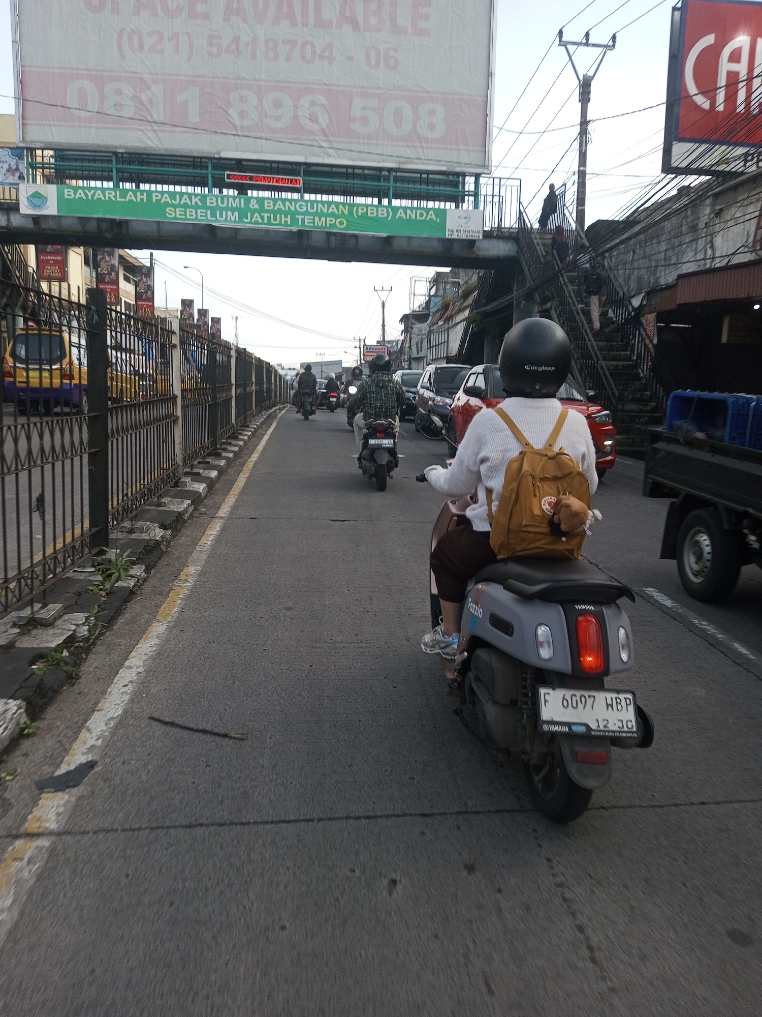 A person wearing a black helmet, white sweater, brown shorts, and light-colored sneakers is riding a gray Yamaha Fazzio scooter with license plate "F 6097 WBP" down a city street. The person has a brown backpack. Several other scooters and cars are ahead in the same lane. A metal fence runs along the left side of the road. Above the road is a pedestrian bridge with an advertisement that includes the phrases "SPACE AVAILABLE" and "BAYARLAH PAJAK BUMI & BANGUNAN (PBB) ANDA, SEBELUM JATUH TEMPO." A pedestrian bridge with stairs is visible on the right side. A sign with "Alfomart" is partially visible on the right. This image does not show evidence of being in Mya Sit Kaing Ywar Thit, Myanmar.