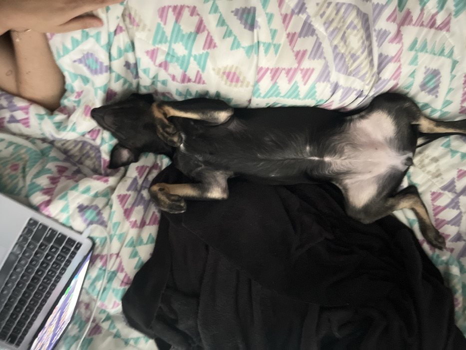 The image depicts an indoor scene, likely a bedroom, located in Bogota, Colombia. A small, black and tan dog is resting on its back on a bed, with its light-colored belly exposed. Its four paws are curled inward towards its chest, and its head is tilted upwards. The bed is covered by a duvet featuring a geometric pattern in white, light blue, pink, and purple hues. In the upper left quadrant of the frame, a silver laptop with an open screen displaying colorful content is positioned on the patterned bedding. To the left of the dog, a dark-colored blanket or throw is partially visible. A human forearm and hand, exhibiting a small, faint heart-shaped tattoo on the forearm, are resting on the patterned bedding in the upper right quadrant of the image.