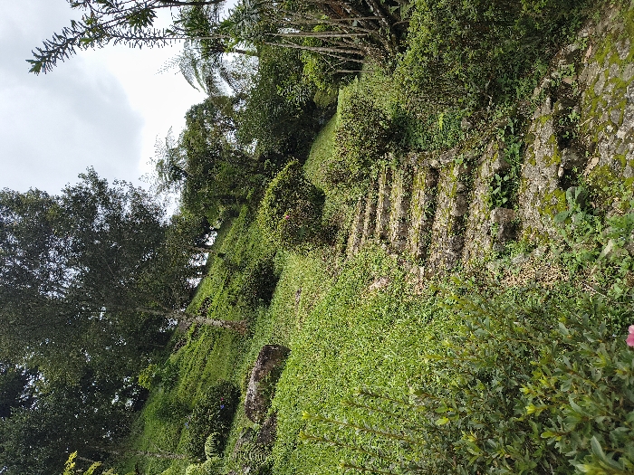 A hillside scene features stone steps covered in moss leading upwards. Dense greenery and trees cover the slope. The steps appear aged, blending into the natural environment. Lush foliage surrounds the path, partially obscuring the steps. The sky is overcast. A portion of a tree is visible at the top of the frame and bushes and trees on either side of the steps add a vibrant green color to the image.