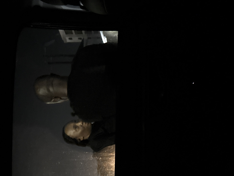two people in darkness, captured through a window or glass pane with a reflection. One person is bald and wearing a dark shirt, while the other has long hair and is also in dark clothing. The surrounding environment is dimly lit, with the faintest suggestion of a building structure visible in the background. The right side of the image is mostly black.