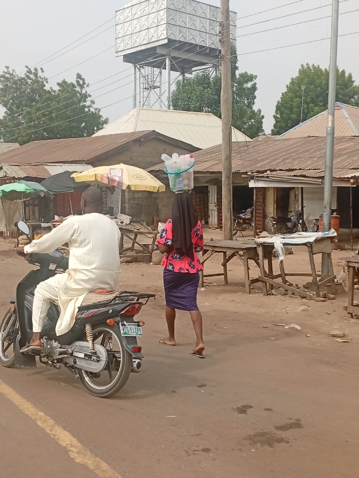 The scene takes place on a paved street in Nassarawan Eggon, Nigeria (latitude: 8.713, longitude: 8.541). A man wearing a white robe is driving a black motorcycle. A woman wearing a red and black dress is walking away from the camera, carrying a bucket on her head. There is a water tower in the background. There are several buildings with roofs made of corrugated metal. There are tables and chairs in front of some of the buildings, which appear to be shops. There is a yellow umbrella in the background. The street is dusty. The environment appears to be hot and dry. There is a small white building on the left side of the image with the entrance blocked by a blue metal gate. There are multiple power lines overhead. The man on the motorcycle is the focus of the image. The woman is walking away from the camera, but she is in the foreground, so she is still visible. The motorcycle has a license plate that reads "BG-61391". There is also a green umbrella visible on the left side of the image. There is no clear indication of time of day.