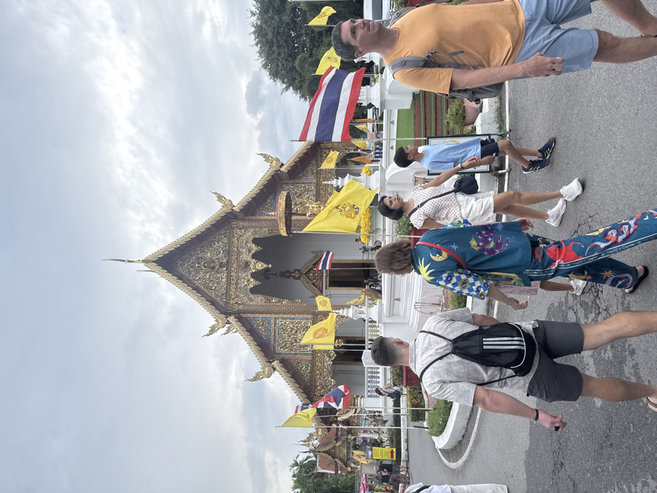 The image depicts an outdoor scene at Wat Phra Singh Woramahawihan in Chiang Mai City Municipality, Thailand, under an overcast sky. In the background, the ornate, golden-roofed Viharn Luang of the temple stands prominently, featuring intricate gold carvings on its gable and white supporting columns. Numerous flags are displayed in front of the temple, including Thai national flags (red, white, blue stripes) and solid yellow Buddhist flags, some adorned with a circular symbol. In the foreground and midground, a paved dark gray surface serves as a walkway or road. A raised, curved planter with white curbing and green foliage is visible to the left. Multiple individuals are walking across the scene: * On the far left, a male subject walks away from the camera, wearing a light-colored short-sleeved shirt, dark shorts, sandals, and a black Adidas drawstring backpack. * Next to him, a female subject walks away, dressed in a distinctive teal-blue patterned long-sleeved shirt and matching long pants with colorful designs, carrying a red strap. * Further right, a female subject walks from right to left, wearing a white short-sleeved top, white shorts, and white sneakers, with a dark shoulder bag. * Adjacent to her, a male child walks from right to left, wearing a light blue short-sleeved shirt, dark shorts, and dark sneakers. * On the far right, a male subject walks from left to right, wearing an orange short-sleeved shirt, light blue shorts, and a dark backpack. Trees are visible in the background on both sides of the temple, and a white vehicle is partially visible on the far right.