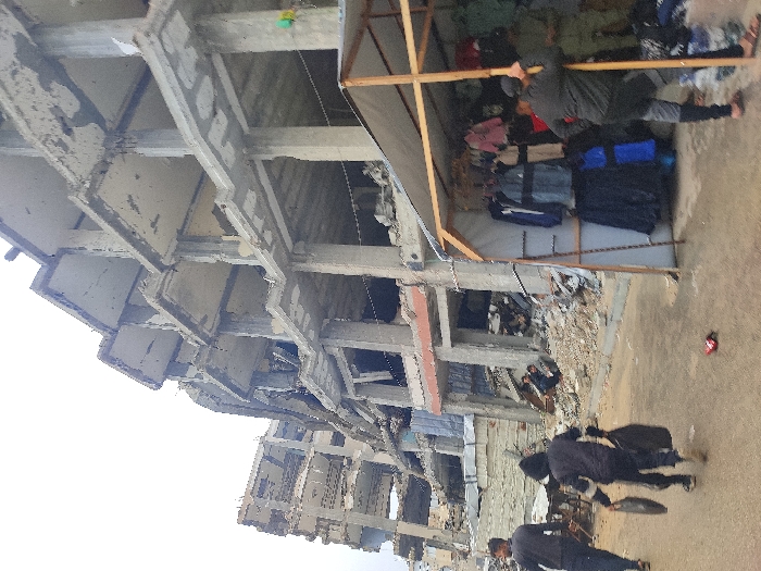The image depicts a street scene in Khan Yunis, Palestinian Territory, dominated by heavily damaged multi-story buildings under an overcast sky. In the background, several concrete structures show extensive damage, with most exterior walls missing, revealing reinforced concrete frameworks, exposed rebar, and floor slabs. Piles of concrete rubble and debris are accumulated at the base of these buildings and extend onto the adjacent paved street. In the midground, on the right side of the street, a makeshift market stall stands. It is constructed from wooden poles supporting a white tarp roof and displays various items of clothing, including jackets, shirts, and trousers, hanging and piled. One individual, wearing dark clothing and a cap, is visible inside the stall, leaning on a wooden support. Further into the midground, near the damaged buildings on the left, at least two other individuals are discernible sitting amidst the rubble. In the foreground, on the left, two individuals walk away from the camera on the paved street. The leading person, clad in dark clothing and a hoodie, carries two dark bags in their left hand. A smaller, red object lies discarded on the street surface in the foreground.