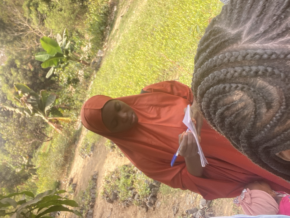 An adult female, positioned off-center to the right, is observed outdoors in Barnawa, Nigeria. She wears an orange head covering (hijab) and matching attire, looking downwards with focus. Her right hand holds a blue ballpoint pen, actively writing on a small, white paper notebook. The top of another individual's head, featuring dark hair styled in multiple intricate braids, occupies the lower right foreground. A small portion of a third individual, possibly a child, with a pink head covering, is visible on the far left. The background features a mixed environment: to the left, an area of dry soil contains numerous small plants or seedlings cultivated in individual black plastic bags, arranged in visible rows. A leafy branch extends into the upper left of the frame. To the right, the ground slopes upwards, covered in green grass and dense vegetation, including several large-leafed plants resembling banana trees and other various trees. The scene is illuminated by direct sunlight.
