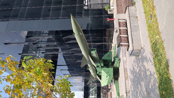 The image displays an outdoor scene in Hong Gai Ward, Vietnam, under a clear, sunny sky. A large, olive-drab surface-to-air missile (SAM), featuring a pointed nose cone, four small mid-body fins, and four larger tail fins, is angled upwards on a matching olive-drab ground-based launcher system. The launcher rests on a raised rectangular concrete platform. In the background, a multi-story, modern building with dark, highly reflective glass panels and angular architectural elements rises. The glass facade reflects the blue sky and surrounding structures. Near an entrance to this building, a sign bears the Vietnamese text "VĂN PHÒNG" and "TIỀN PHÒNG." A red fire hydrant and a white outdoor air conditioning unit are positioned near the building's base. The foreground consists of grey concrete pavement showing tree shadows, bordered by a strip of green grass at the bottom. Two concrete benches with slatted brown seating and backrests are visible on the paved area, situated on low concrete bases. A tree with green and yellowish leaves partially frames the upper left portion of the scene. No individuals are present.