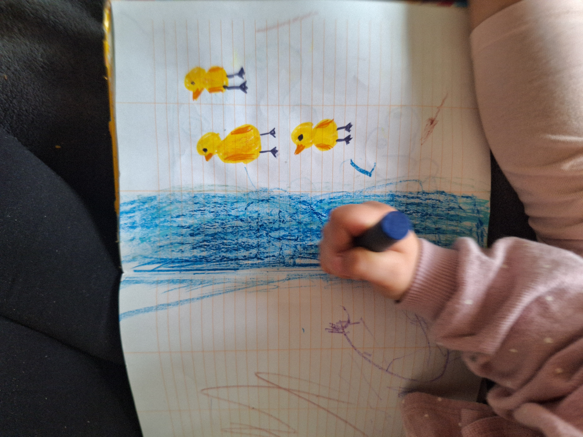 An overhead, close-up photograph depicts a child's hands and arms drawing in an open, lined notebook within a domestic setting in Stara Zagora, Bulgaria. The child's right hand, dressed in a light pink long-sleeved garment with white polka dots, grips a dark blue crayon and is actively coloring the center pages of the notebook. The open notebook features white pages with orange horizontal and faint vertical lines. The right page displays three cartoon-style yellow chicks with orange beaks and black legs. A large central area of the notebook, spanning both pages, is heavily scribbled with blue crayon, resembling a body of water or sky. The left page also contains some faint red and purple crayon marks. The child's lower body, covered by a light beige garment, is partially visible in the foreground, while a dark, textured fabric occupies the background.