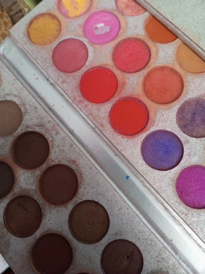- "A close-up, high-angle photographic view depicts an open cosmetic palette containing numerous circular pans of colored pressed powders" by FM-P422V2, licensed under CC BY 4.0