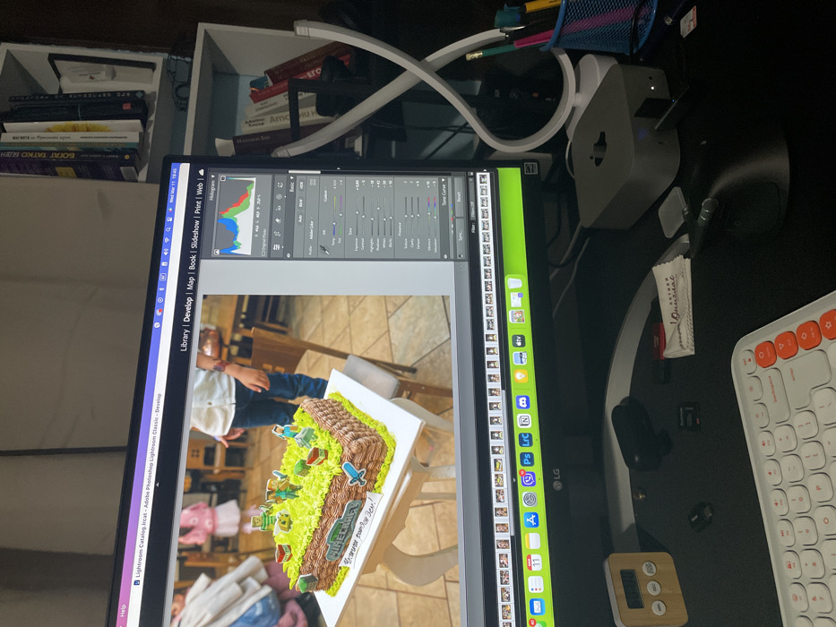 A forensic description of the scene reveals an indoor setting at a desk in the city of Tselina, Bulgaria. A black LG computer monitor, positioned centrally, displays an image being edited within Adobe Photoshop Lightroom Classic. The displayed image features a rectangular "Minecraft" themed birthday cake, decorated with green frosting resembling grass, brown frosting for terrain, and several small cutout "Minecraft" figures including characters (Steve, Alex) and objects (treasure chests, pig, Creeper). The word "MINECRAFT" is visible on the cake's front, along with Cyrillic text that translates to "Happy Birthday!". The cake rests on a white pedestal stand. In the background of the monitor's image, a person in a light shirt and blue jeans stands to the right of the cake, with another person in pink partially visible in the far left. The background suggests an indoor event space with wooden chairs and tables. To the right of the monitor, a silver Apple Mac mini computer is present, with a white, abstract-shaped desk lamp positioned further right, next to a blue mesh pen holder containing writing utensils. On the black desk surface in front of the monitor, a white keyboard with orange accents is visible. Other items on the desk include a bamboo-colored digital timer, various small electronic adapters, and a white packet labeled in Cyrillic as "АНТИСЕПТ ОМИВАНЕ" (Antiseptic Washing). Behind the desk setup, a white shelving unit contains several books, some with Cyrillic titles, notably "БОГАТ ТАТКО БЕДЕН ТАТКО" (Rich Dad Poor Dad). The room is moderately lit, with the monitor screen providing a significant light source.