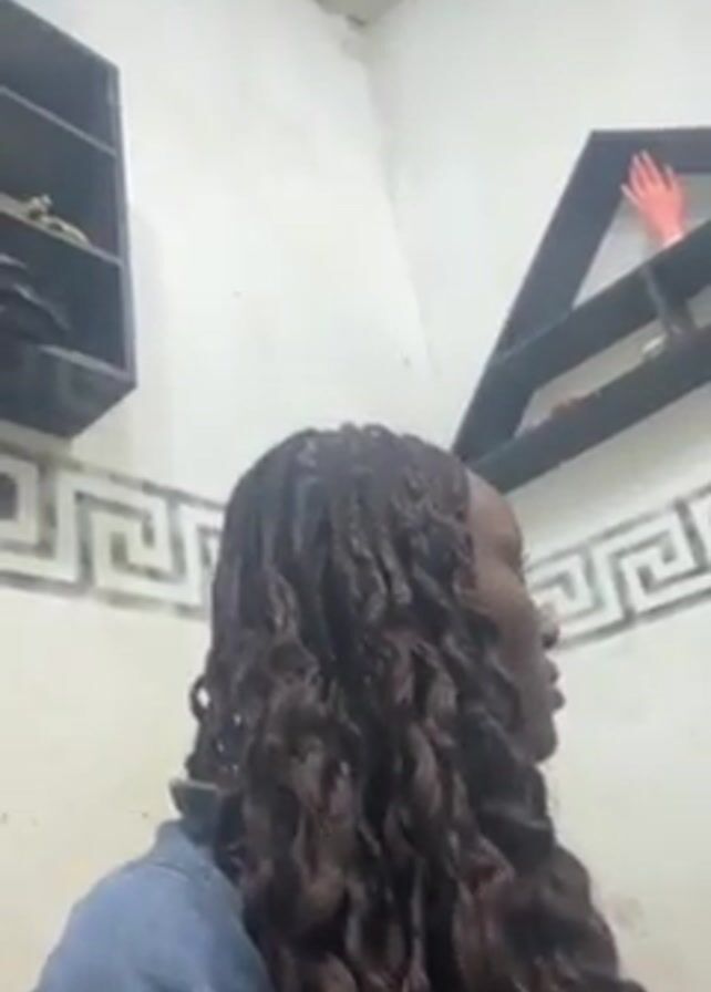 A woman with dark skin and long, dark, curly hair is the primary subject of the video. She's wearing a blue denim jacket and is seated in a room with white walls and a decorative Greek key pattern border. A dark-skinned man with dreadlocks, wearing a white shirt, appears to briefly come into view beside her. The background shows a black shelving unit with various items on display, including what appears to be a mannequin hand. The overall lighting is bright.