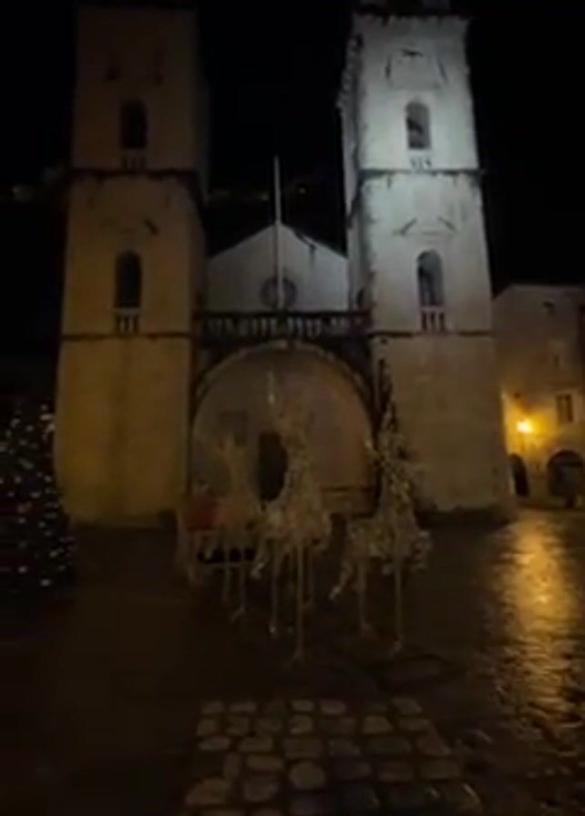 At night, the camera pans across a square in front of an old, stone church with two tall towers. Christmas decorations, including reindeer and a Christmas tree, are placed on the stone pavement in the foreground. The pavement is wet and reflects the light. The church is illuminated by spotlights that highlight its architectural details. Other buildings are visible in the background, adding to the urban setting. The sky is dark, emphasizing the contrast between the lit structures and the surrounding darkness.