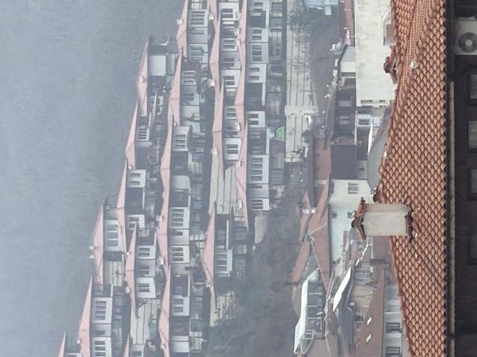 The image displays a dense residential area on a steep hillside in Sveti Vlas, Bulgaria, under hazy atmospheric conditions. Numerous multi-story residential buildings, characterized by light-colored facades and reddish-orange tiled roofs, are arranged in terraced rows ascending the slope. The upper tiers feature uniformly designed units with multiple windows. Sparse, dark green vegetation is visible between the building levels. Structures in the mid-ground and foreground also exhibit reddish-orange tiled roofs, with a prominent light-colored chimney positioned centrally on a foreground roof and a translucent, possibly glass, roof structure on a mid-ground building. An exterior air conditioning unit is partially visible on the bottom right. The distant background is obscured by a light gray haze. No individuals or specific activities are observed within the frame.